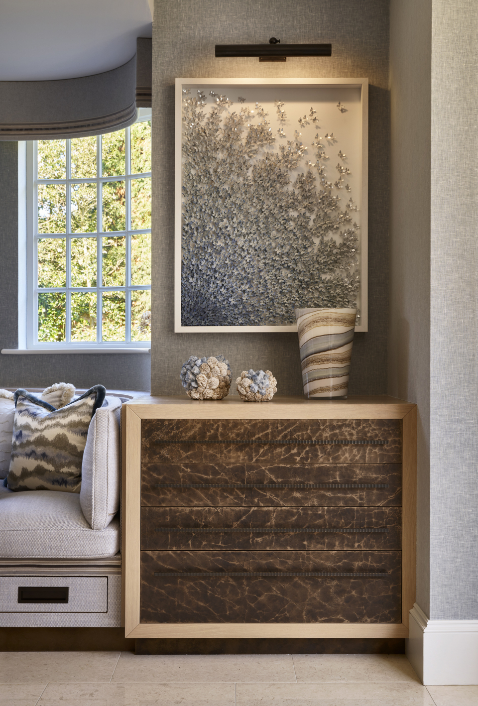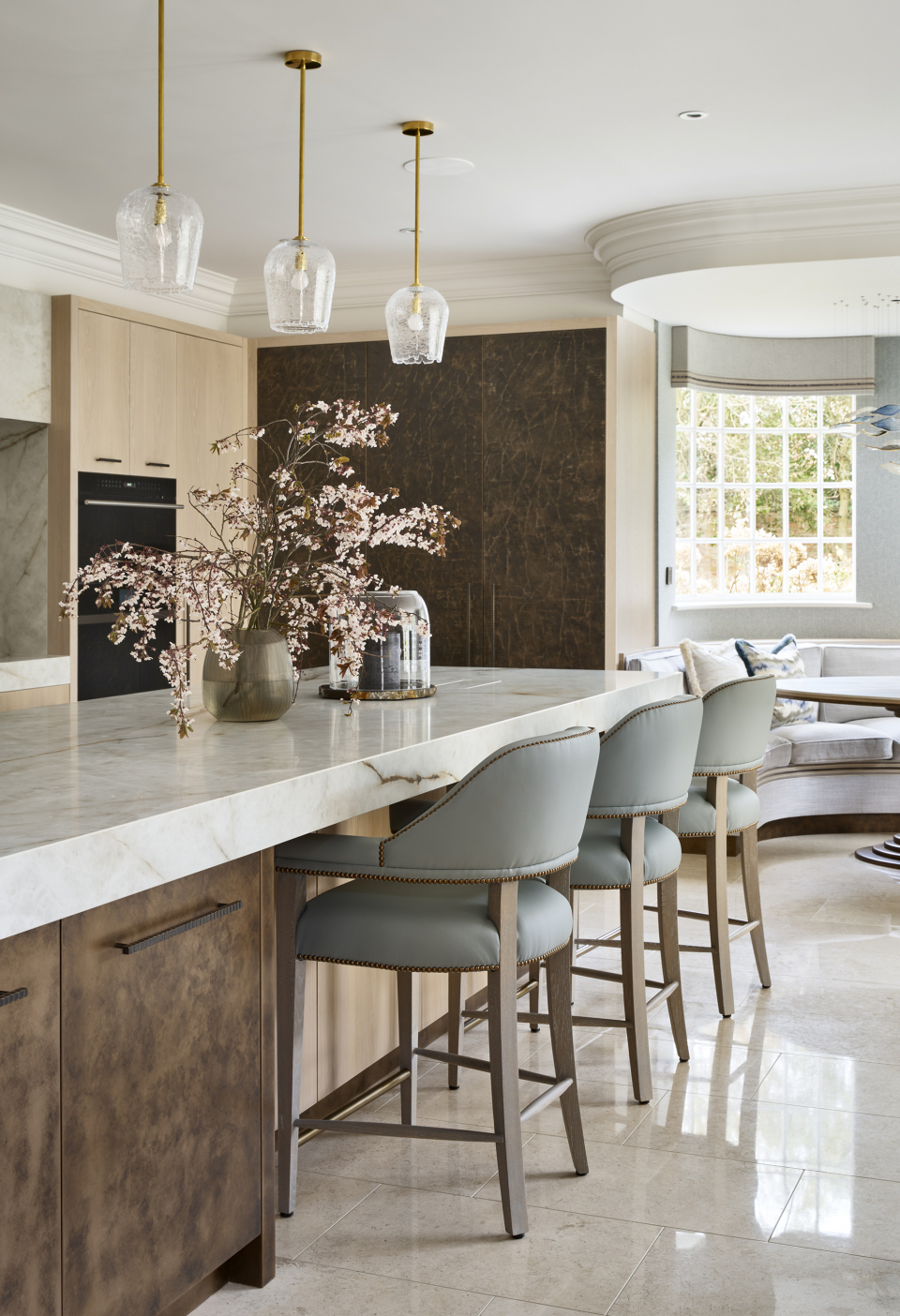 Kitchen re-design with bespoke cabinetry, upholstery & lighting.
